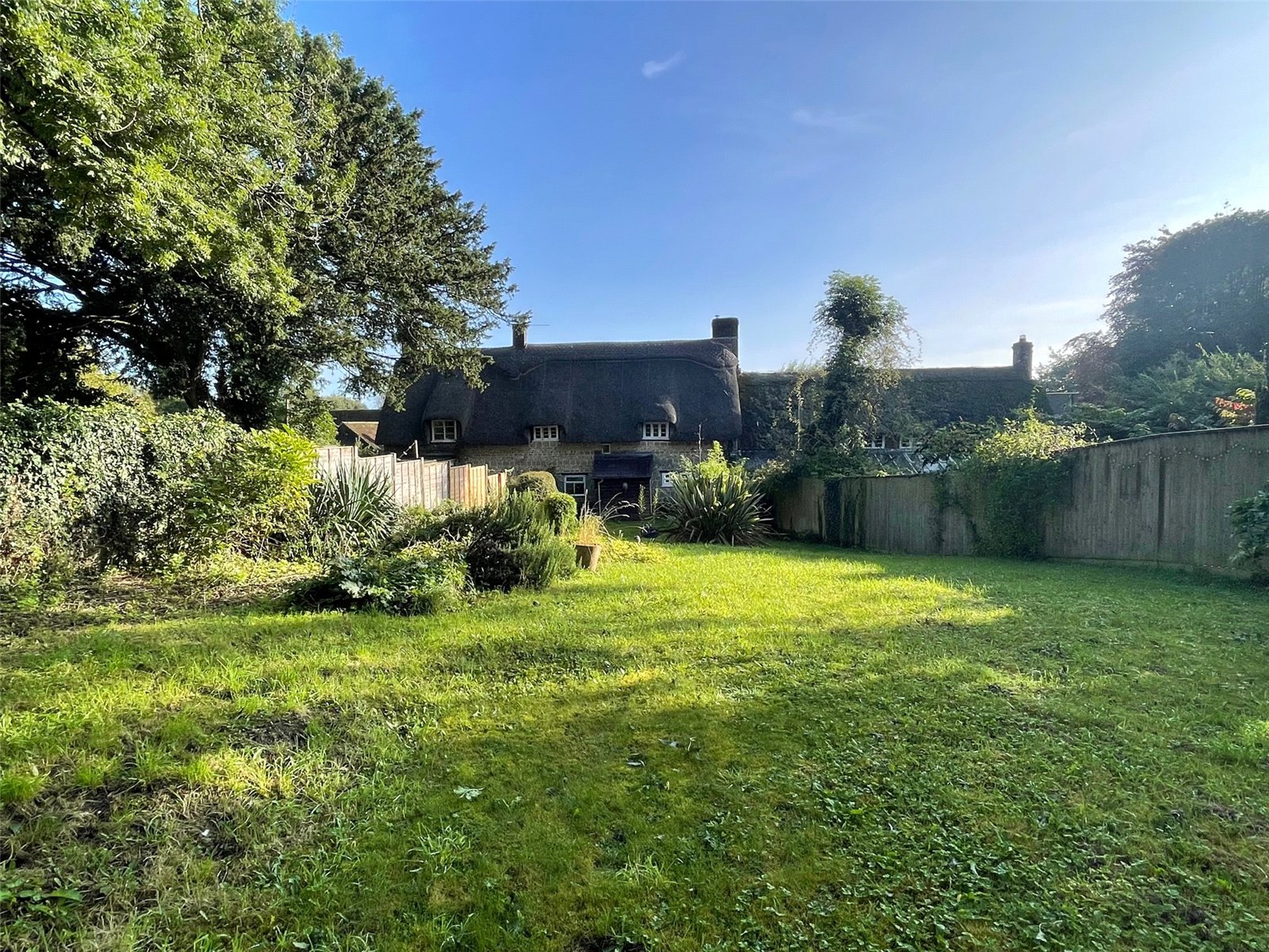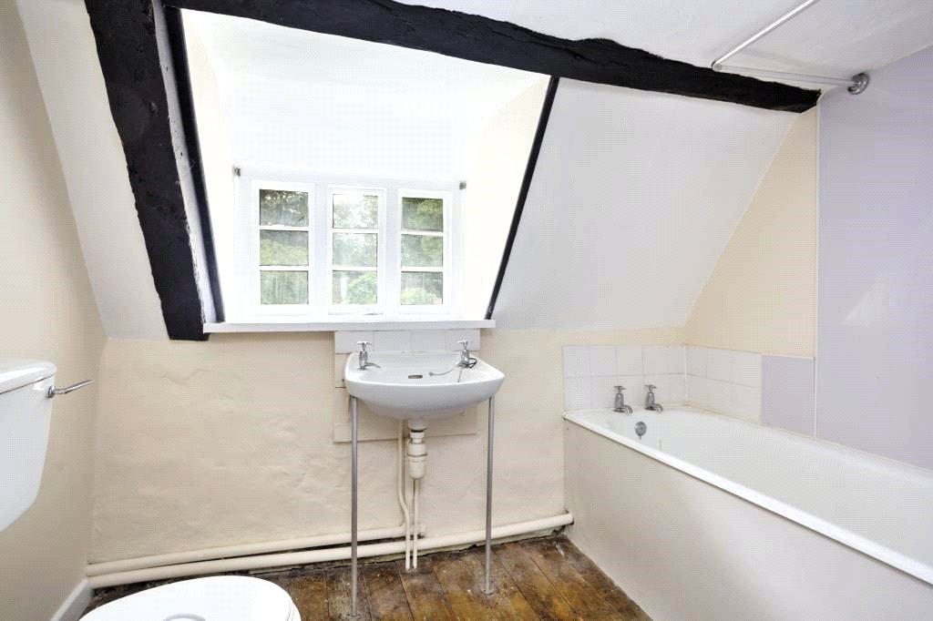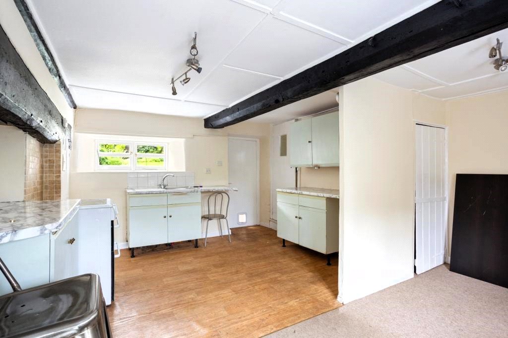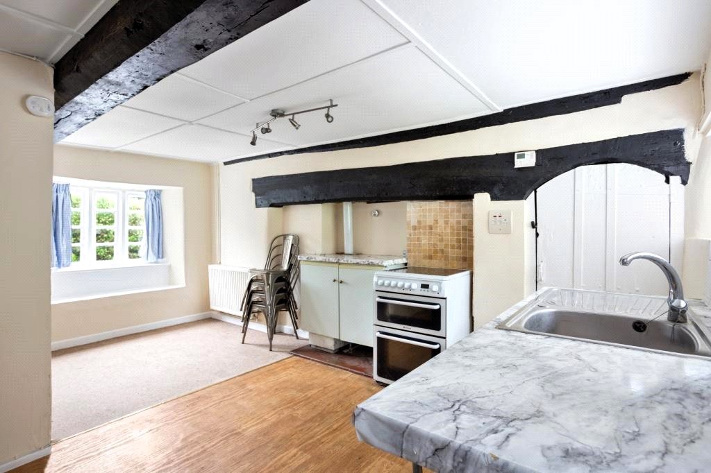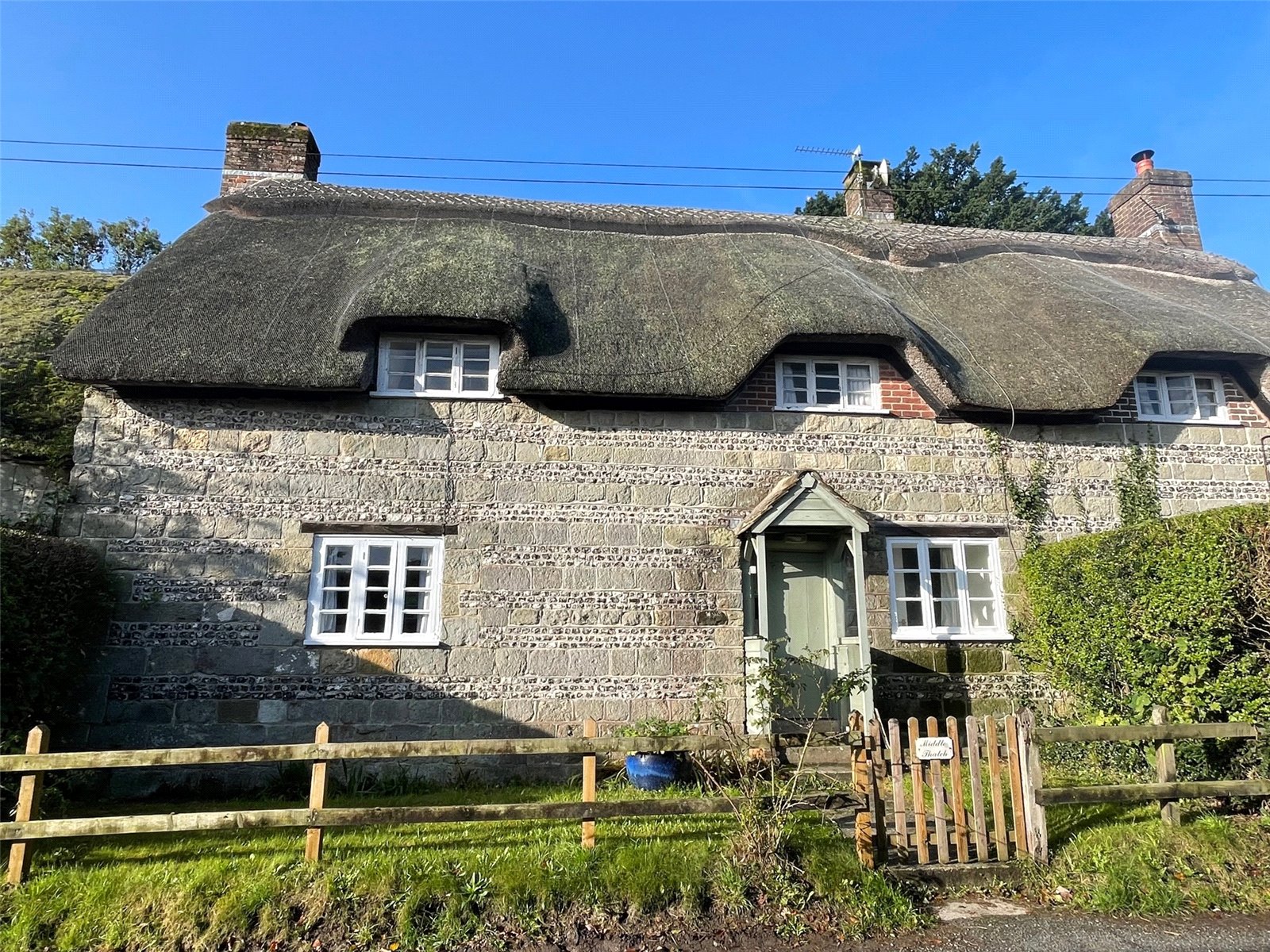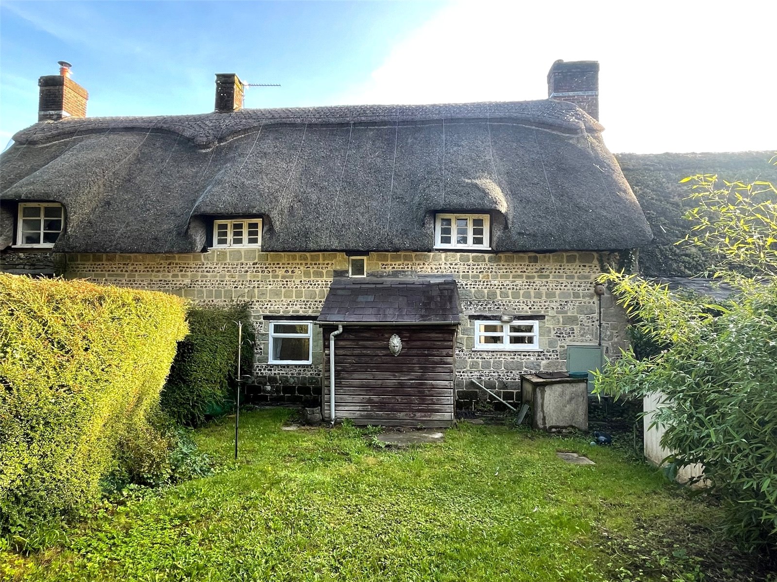 An archetypical English country cottage with its rural village setting, attractive green sandstone & flint external elevations and thatched roof. Grade II Listed, the property is thought to date back to the 17th Century and although it has been modernised over the years and recently partly redecorated, it would benefit from being updated and improved further. An entrance porch leads to a small entrance hall and the ground floor accommodation which consists of a sitting room with a ceiling beam and fireplace whilst the open plan kitchen/dining room has a wooden beamed ceiling, a former inglenook fireplace with a wooden bressomer beam, a deep understairs cupboard and a utility/store cupboard. A rear hall/boot room gives access to the garden. On the first floor are three bedrooms and a bathroom with a paneled bath and a Mira shower.