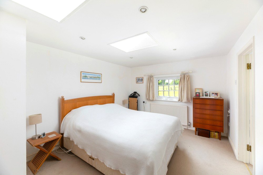 The kitchen has been custom designed and fitted with base level units, polished quartz work surfaces and an oil-fired Aga. The handsome, specially commissioned, oak island unit, is a super feature of the kitchen and can remain if required as could the butler’s pantry cupboard. The kitchen is open plan to the lovely light and airy dining/garden room which has a partly glazed ceiling, French windows to the garden and is fitted with utility, boiler and storage cupboards. The kitchen and dining/garden room have underfloor heating.