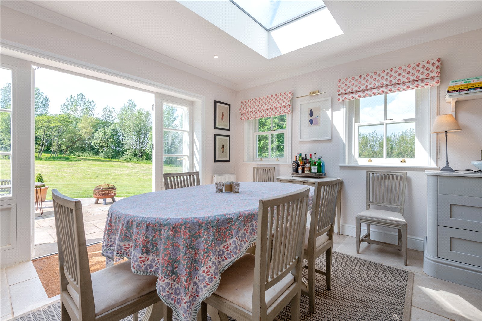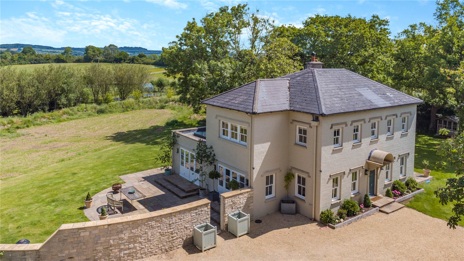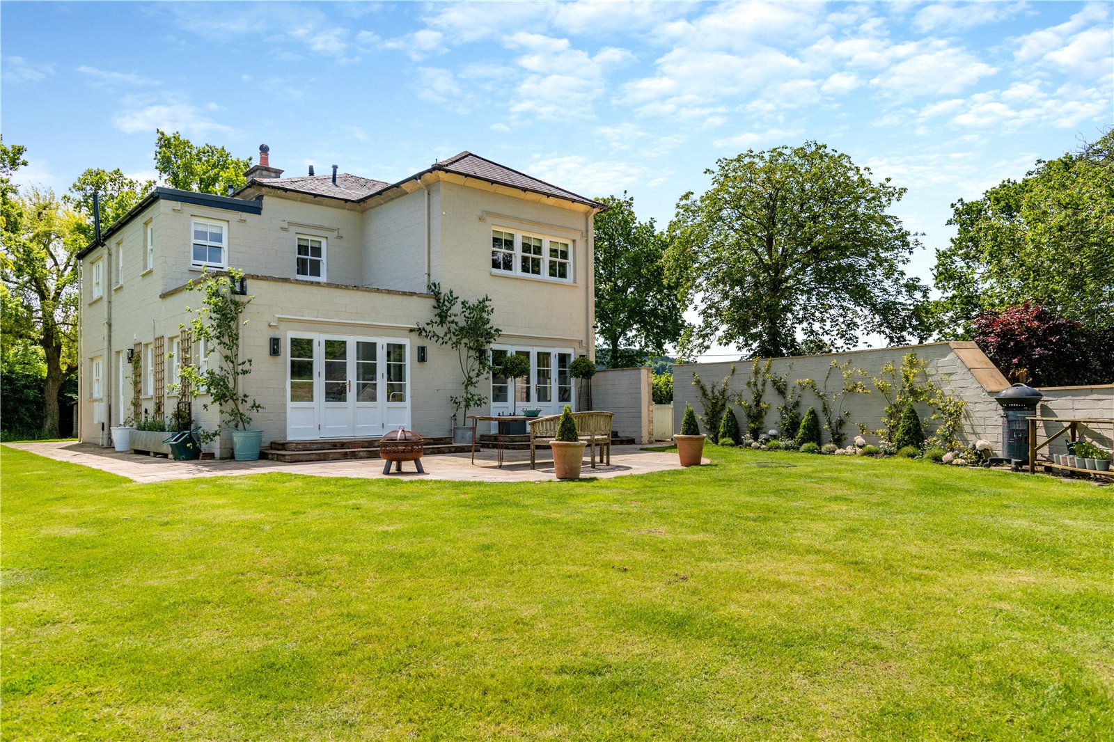 The house is approached over a gravelled driveway, providing ample parking for several cars. The garden surrounding the property is mainly laid to lawn with mature trees on the boundary. The large, paved terrace is ideal for al fresco dining and entertaining.