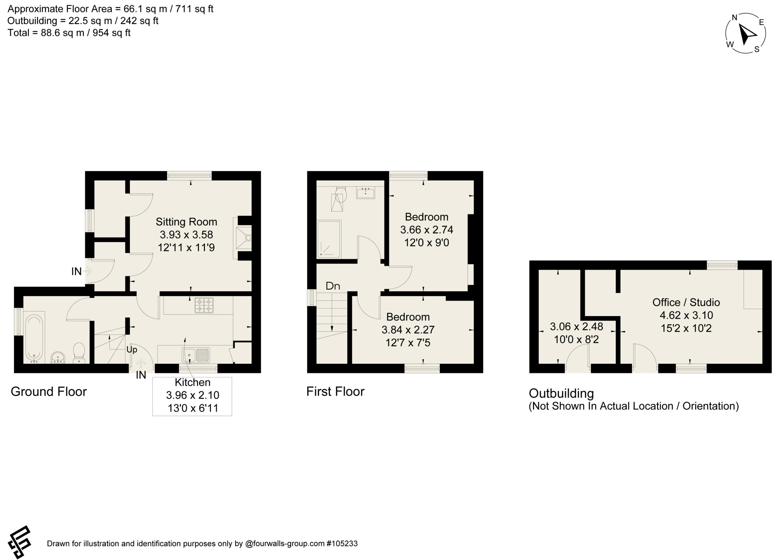 The property is approached via a driveway with parking at the side for two or three cars at the side. The garden is presently a blank canvass for a new owner to landscape and stock which at the front has an area of lawn with laurel hedging whilst the rear is southwest facing and backs onto a stream. Between the back of the house and the office is a small gravelled courtyard.
