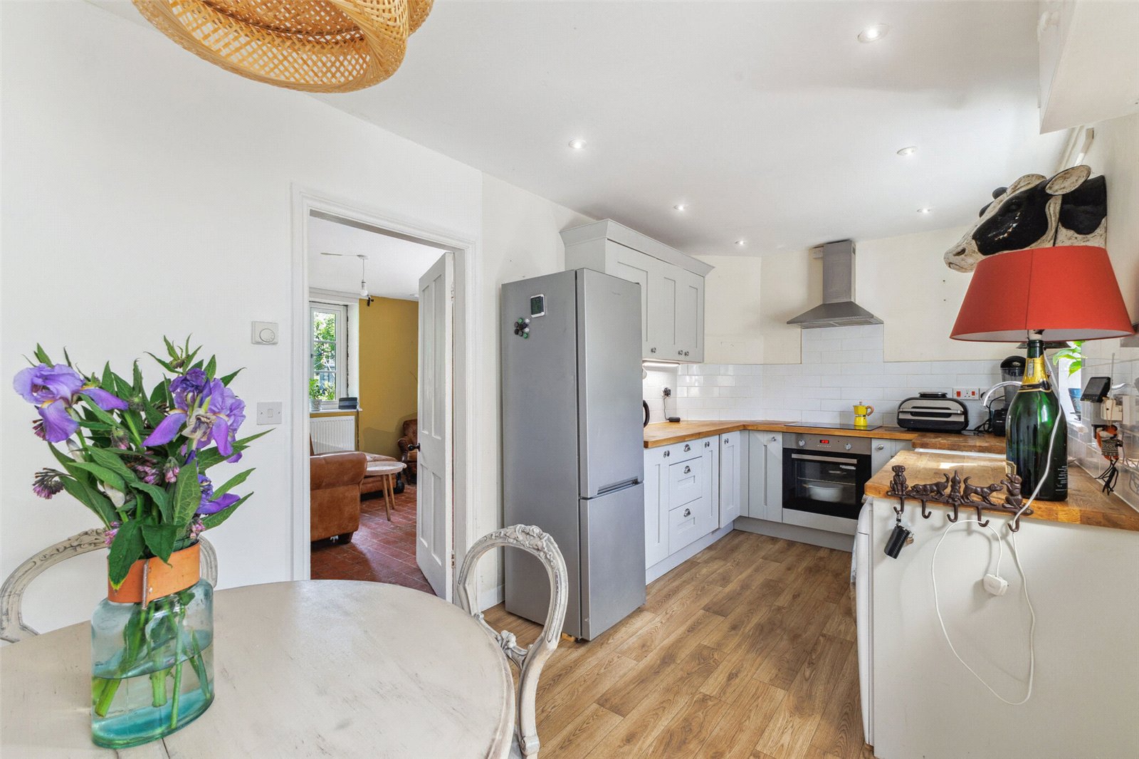 A semi-detached older style former estate cottage built with stone faced external elevations and brick detailing under a clay tiled roof. The well-presented accommodation has high ceilings and comprises a good-sized sitting room with a Villager woodburning stove and quarry tiled floor whilst the kitchen/dining room is fitted with a range of eye and base level cupboards, wooden work surfaces and a butler style sink.