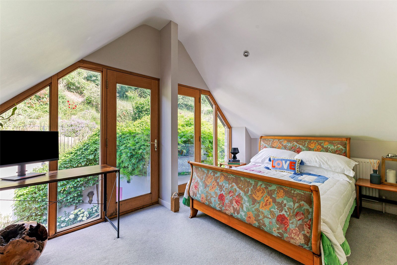 Upstairs the first-floor galleried landing has large South facing windows making it very light and leads to the two double bedrooms which both have vaulted ceilings and fitted cupboards whilst the bathroom is very well-appointed.