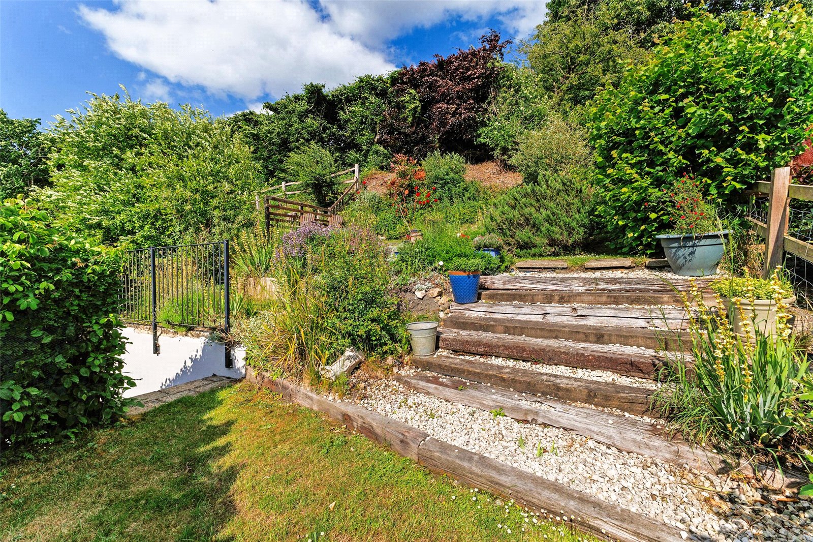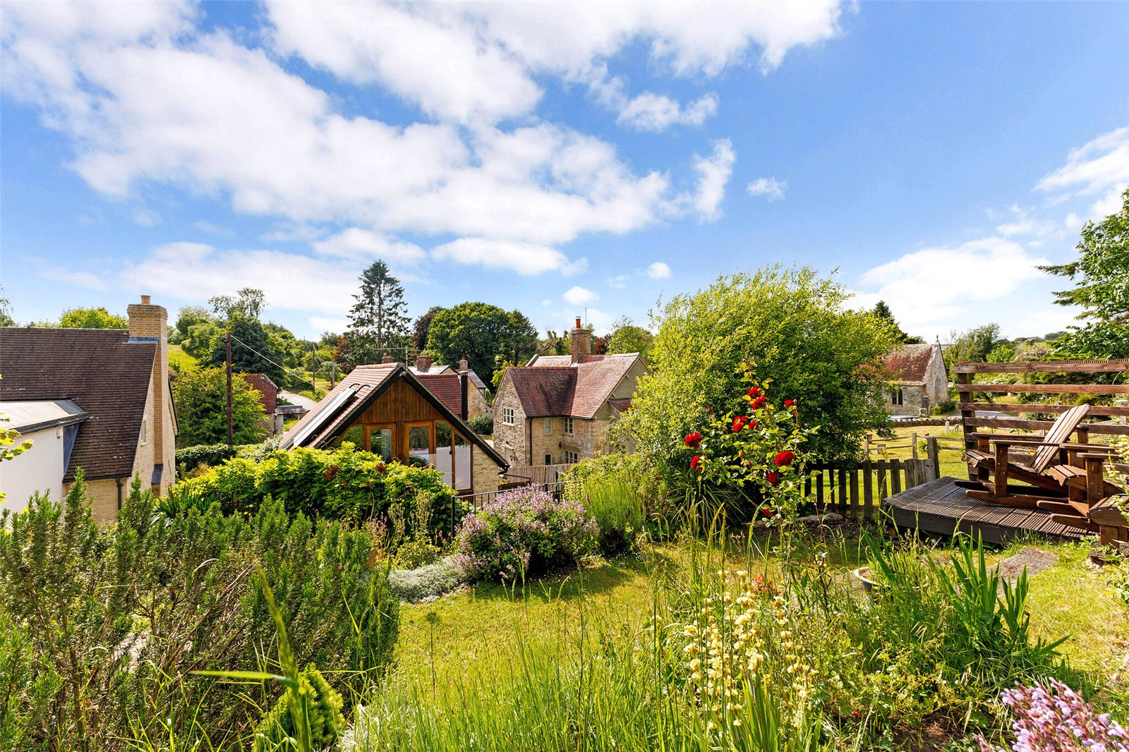 The property is approached via a gravelled drive providing off street parking with herbaceous borders and access either side to the rear and the sheltered paved courtyard garden with steps up to the delightful raised garden arranged on various levels with areas of lawn, flower, shrub and rose borders and a wooden deck with views over the village and towards the church.