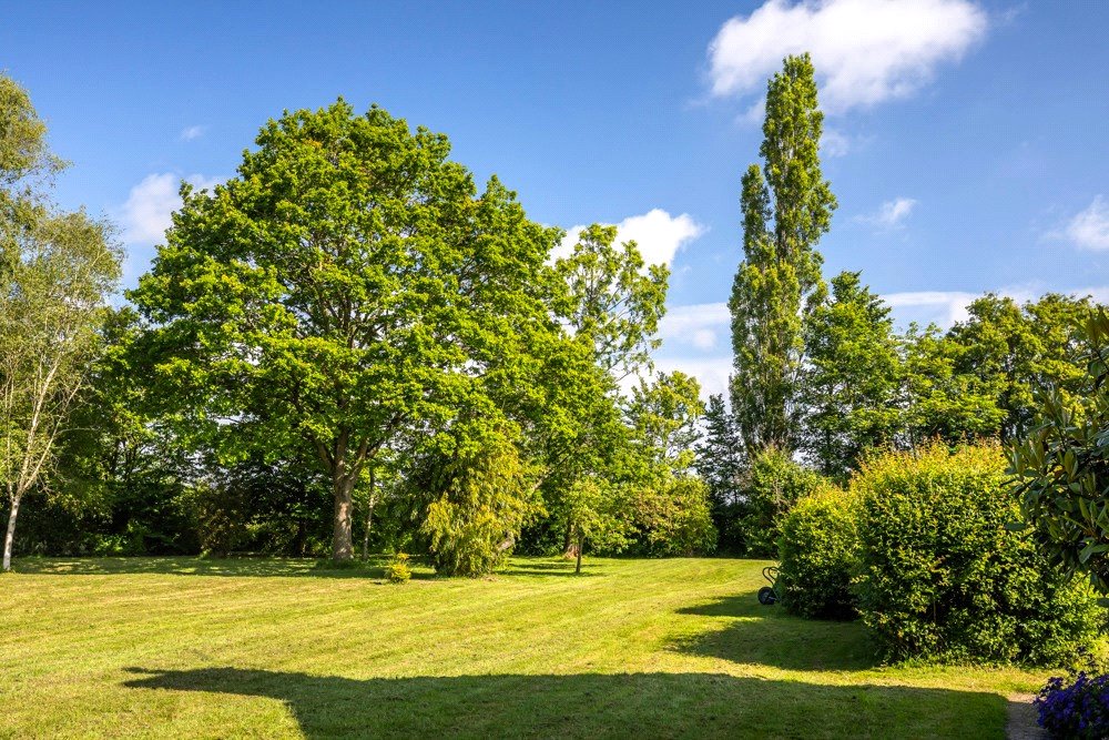 Beyond the formal gardens is a tranquil woodland/wildlife area with several types of mature British native broadleaf trees, a pond and an open glade overlooked by a cabin/studio.