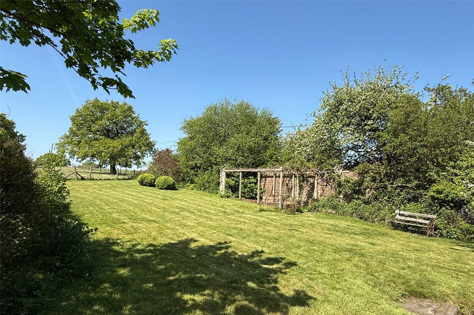 To the rear is a paved terrace to the back of the cottage with raised flower and shrub borders and steps up to the delightful West facing garden which has a lovely outlook over fields and is mainly laid to lawn with flower and shrub borders, a rose covered pergola and garden shed.