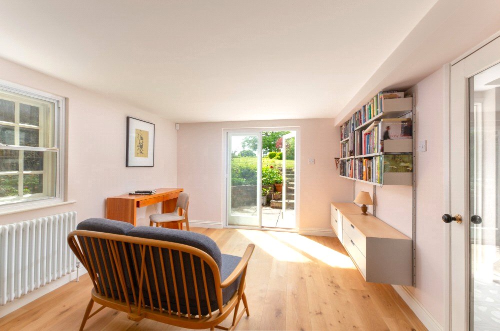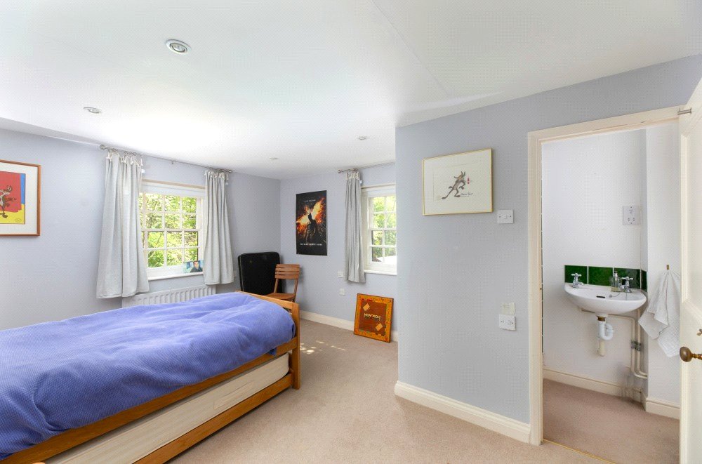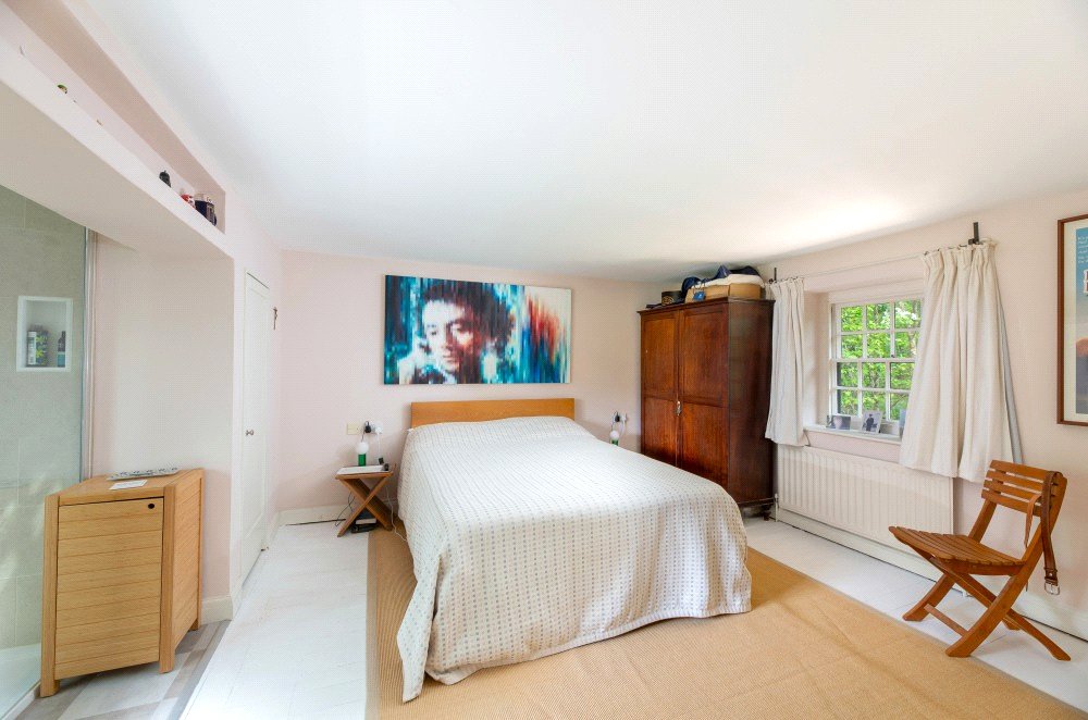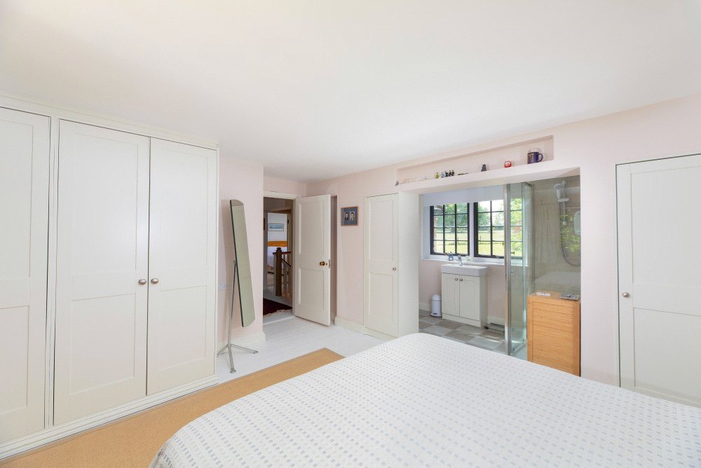 The kitchen has been custom designed and fitted with base level units, polished quartz work surfaces and an oil-fired Aga. The handsome, specially commissioned, oak island unit, is a super feature of the kitchen and can remain if required as could the butler’s pantry cupboard. The kitchen is open plan to the lovely light and airy dining/garden room which has a partly glazed ceiling, French windows to the garden and is fitted with utility, boiler and storage cupboards. The kitchen and dining/garden room have underfloor heating.