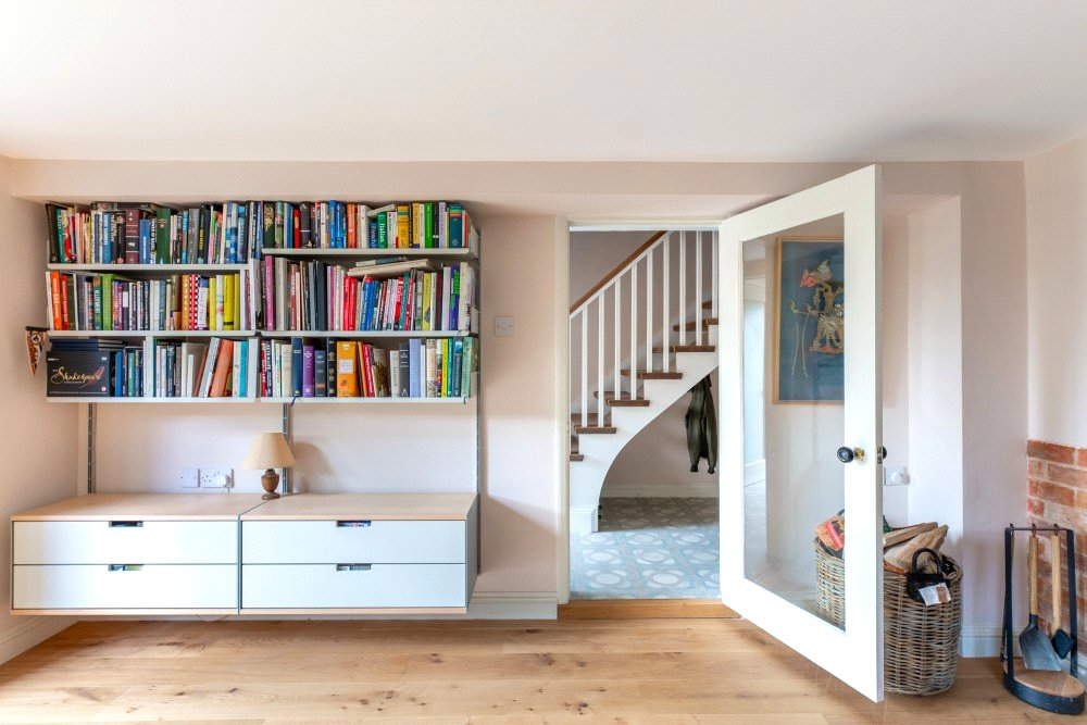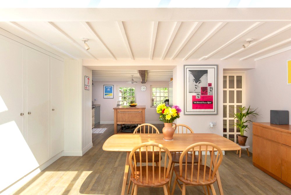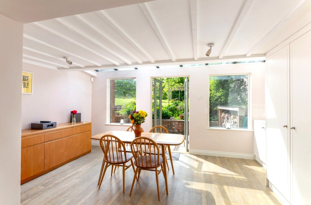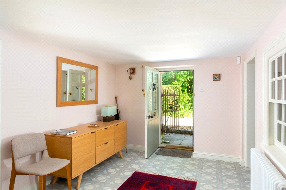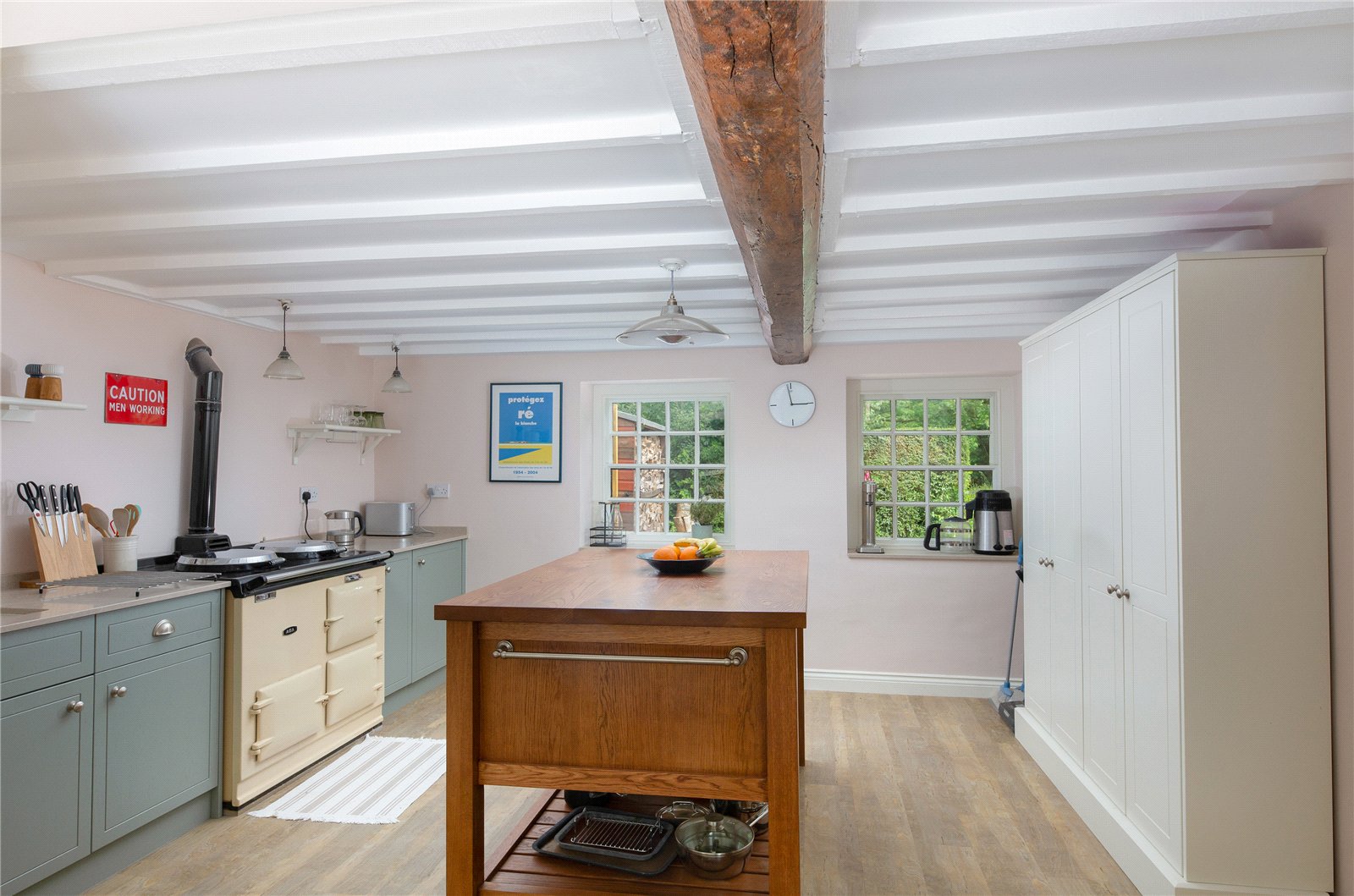 The kitchen has been custom designed and fitted with base level units, polished quartz work surfaces and an oil-fired Aga. The handsome, specially commissioned, oak island unit, is a super feature of the kitchen and can remain if required as could the butler’s pantry cupboard. The kitchen is open plan to the lovely light and airy dining/garden room which has a partly glazed ceiling, French windows to the garden and is fitted with utility, boiler and storage cupboards. The kitchen and dining/garden room have underfloor heating.